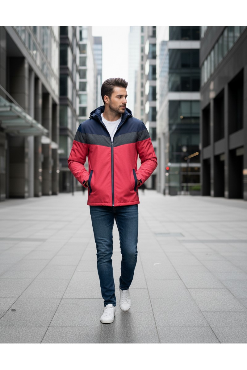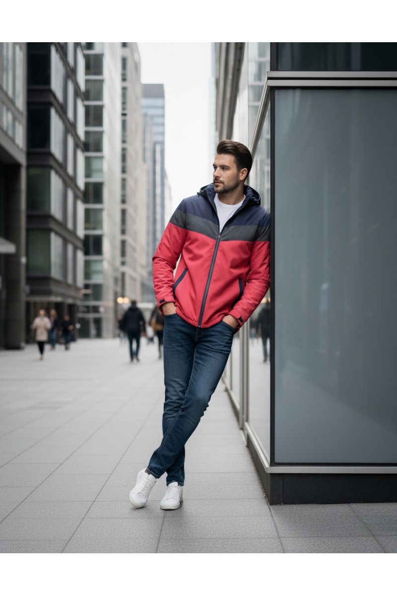 Kurtka męska przejściowa - wiatrówka z kapturem - 8GCZ - granatowo - czerwona